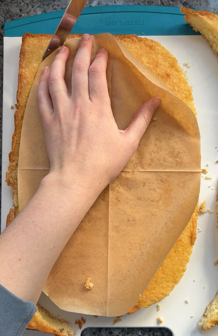 Carve the layers: To make an oval template, take a 9x13 in sheet of parchment paper and fold it into quarters (first in half along the length of the sheet, then in half along the width). Use a pencil to carefully trace an arch between the two diagonally opposite corners and cut along this line (this is a bit tricky to describe, so take a look at my video to see the shape!)